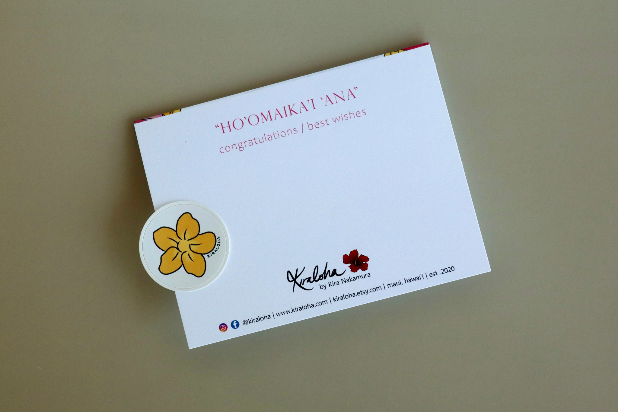 “HO’OMAIKA’I” can be used as “Cheers!”, “Best Wishes!”, and of course, “Congratulations!” Perfect for all of life’s milestones: newlyweds, new parents, new job/promotion, moving, new home owners, and everything in-between! Hand-drawn (digitally) and designed by me. Ho'omaika'i Ana = Congratulations (to you) • Single note card • Blank inside • Envelope seal included • Plain white envelope included • Matte finish • Dimensions: 5.5" x 4" • Printed on 100-lb card stock